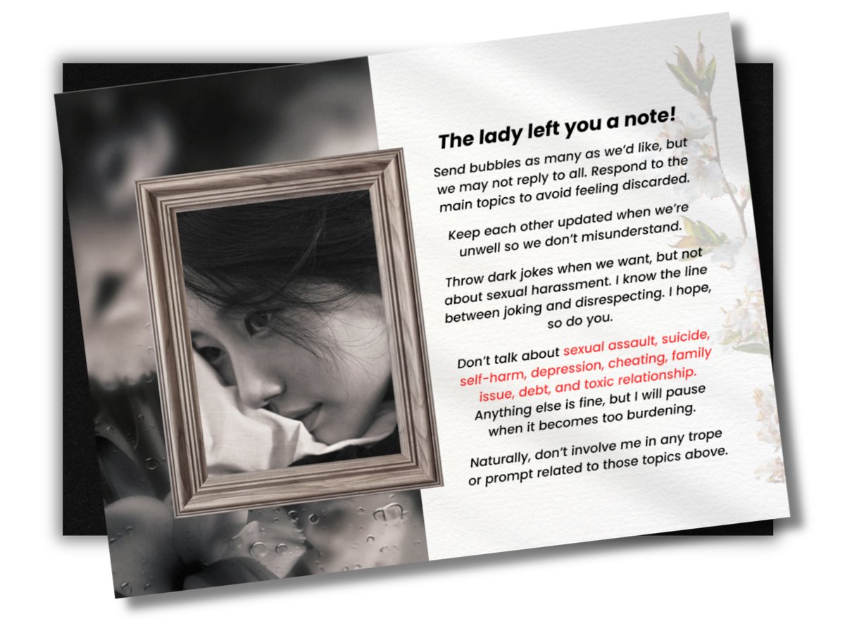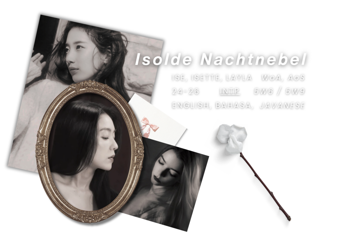Through books, poetry, and brewing tea, she finds the meaning of life. Flowery scent is her cherished fragrance and with that, she would walk into the room with her braided long hair, summer dress, and Earth-toned color painted nails. Underneath the reserved and hard-to-approach facade, there lies a gentle and softspoken figure with immense compassion in her heart. Blessed in abundant wits, she is a reliable and matured person you would go to when you feel troubled and trapped.Well-composed and meticulous, she always knows what to do and what to speak. Isolde pursues to be a well-versed yet a humble person. She loves to provoke genuine connection with her surrounding, making her an affectionate, easy going, also pliant woman.Isolde is both logical and empathetic. She focuses on hearing the unheard, has multiple point of views, and prioritize understanding rather than judgementㅡmaking sure you are seen. Should you wish, she welcomes those who seek advicesㅡhoping her small portion would contribute to helping you mitigate your troubles. Should you wish not, Isolde can comfort you with calming words instead. Do take a note, she won't sugarcoat things.Isolde is a humorous one, though in the strangest senseㅡespecially when met with equally deranged and unhinged souls. She uses her sass and cheekiness to create jokes as she is actually a goofy person who loves to throw banters and bickers. Unafraid to show what she feels, she might appear fiery and expressive. Nonetheless, she embraces the protective and motherly instinct she found within herself, thus she still treats people delicately with tremendous care.The lady identifies as a queer womanㅡpanromantic demi-bisexual, if it is needed to be knownㅡ who is open and vocal about her community. She has been educating herself on gender expression and sexual identity, making her queer conscious who keeps learning. She offers a safe place for her people, and fundamentally, she rejects discrimination towards any identity.
